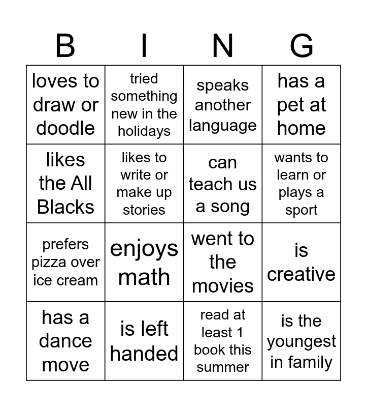 This bingo card has 16 words: is left handed, is creative, speaks another language, loves to draw or doodle, prefers pizza over ice cream, tried something new in the holidays, went to the movies, read at least 1 book this summer, likes the All Blacks, likes to write or make up stories, has a dance move, has a pet at home, enjoys math, wants to learn or plays a sport, can teach us a song and is the youngest in family.
