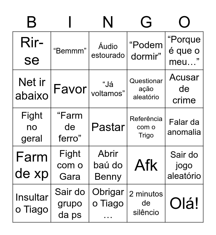 This bingo card has a free space and 24 words: Insultar o Tiago, Fight com o Gara, “Já voltamos”, 2 minutos de silêncio, “Porque é que o meu…”, Rir-se, “Bemmm”, Áudio estourado, Referência com o Trigo, Falar da anomalia, Fight no geral, Favor, Afk, Sair do jogo aleatório, Net ir abaixo, Sair do grupo da ps, Obrigar o Tiago …, “Podem dormir”, Acusar de crime, Farm de xp, “Farm de ferro”, Abrir baú do Benny, Questionar ação aleatório and Olá!.