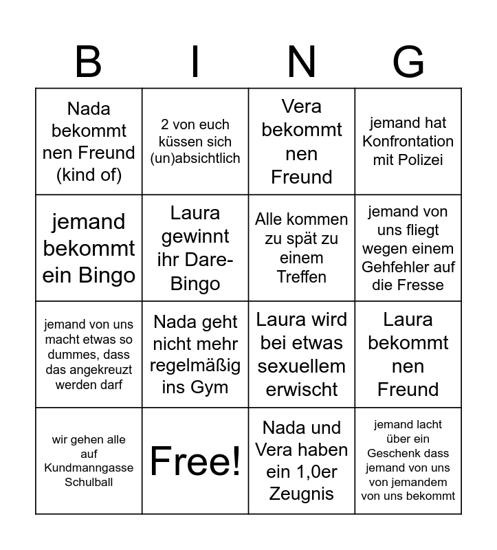 This bingo card has 16 words: Free!, Laura bekommt nen Freund, Vera bekommt nen Freund, Nada bekommt nen Freund (kind of), jemand von uns macht etwas so dummes, dass das angekreuzt werden darf, 2 von euch küssen sich (un)absichtlich, Laura wird bei etwas sexuellem erwischt, Nada und Vera haben ein 1,0er Zeugnis, jemand bekommt ein Bingo, Laura gewinnt ihr Dare-Bingo, wir gehen alle auf Kundmanngasse Schulball, jemand hat Konfrontation mit Polizei, Nada geht nicht mehr regelmäßig ins Gym, jemand von uns fliegt wegen einem Gehfehler auf die Fresse, Alle kommen zu spät zu einem Treffen and jemand lacht über ein Geschenk dass jemand von uns von jemandem von uns bekommt.