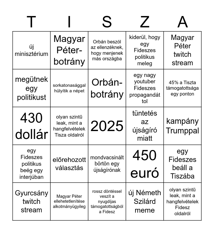 This bingo card has a free space and 24 words: előrehozott választás, Magyar Péter ellehetetlenítése alkotmányügyileg, Orbán-botrány, Gyurcsány twitch stream, Magyar Péter twitch stream, új minisztérium, megütnek egy politikust, Magyar Péter-botrány, tüntetés az újságíró miatt, mondvacsinált börtön egy újságírónak, egy nagy youtuber Fideszes propagandát tol, 430 dollár, 450 euró, egy Fideszes beáll a Tiszába, sorkatonasággal hülyítik a népet, új Németh Szilárd meme, kampány Trumppal, Orbán beszól az ellenzéknek, hogy menjenek más országba, 45% a Tiszta támogatottsága egy ponton, olyan szintű leak, mint a hangfelvételek Tisza oldalról, olyan szintű leak, mint a hangfelvételek Fidesz oldalról, egy Fideszes politikus beég egy interjúban, kiderül, hogy egy Fideszes politikus meleg and rossz döntéssel veszít a nyugdíjas támogatottságból a Fidesz.