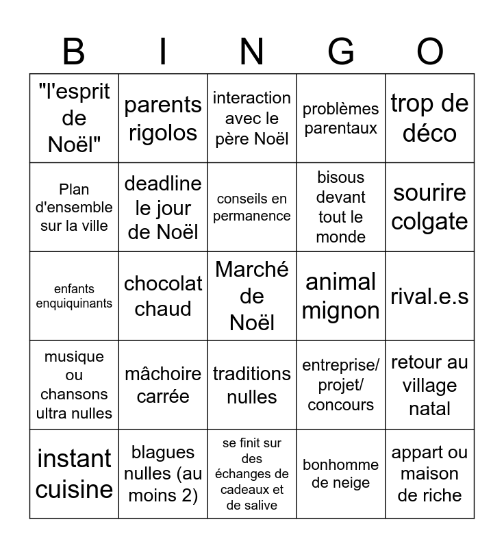 This bingo card has a free space and 24 words: mâchoire carrée, blagues nulles (au moins 2), conseils en permanence, instant cuisine, trop de déco, "l'esprit de Noël", Plan d'ensemble sur la ville, parents rigolos, animal mignon, traditions nulles, bisous devant tout le monde, enfants enquiquinants, entreprise/ projet/ concours, retour au village natal, deadline le jour de Noël, bonhomme de neige, rival.e.s, interaction avec le père Noël, sourire colgate, chocolat chaud, appart ou maison de riche, musique ou chansons ultra nulles, problèmes parentaux and se finit sur des échanges de cadeaux et de salive.