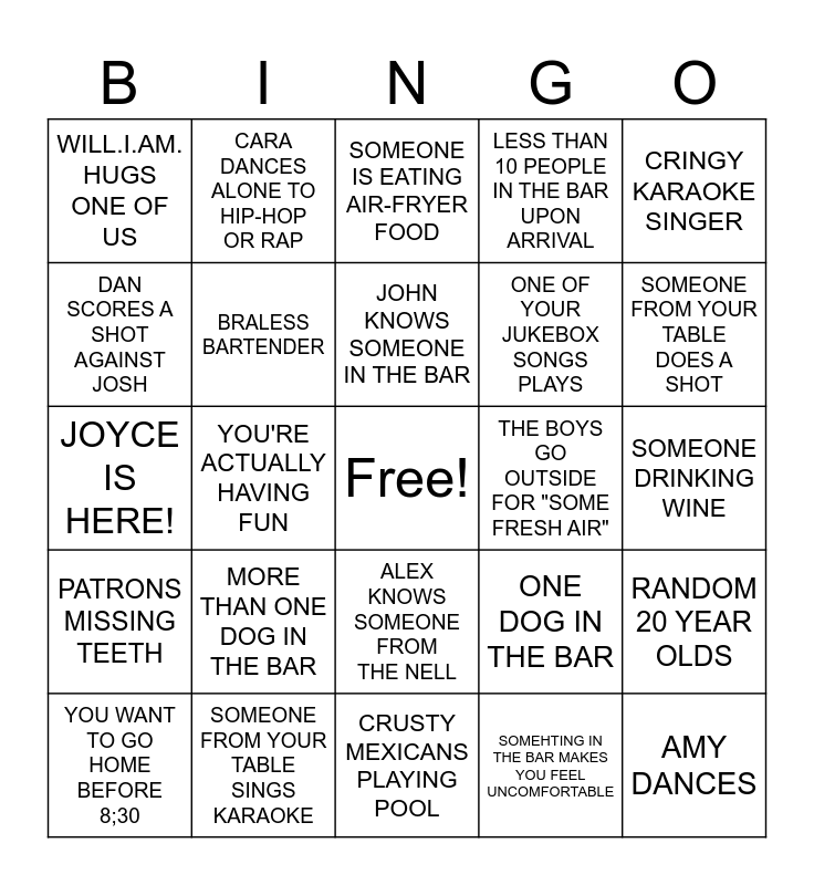 This bingo card has a free space and 27 words: ONE DOG IN THE BAR, TABLE OF AWKWARD HUMANS, ONE OF YOUR JUKEBOX SONGS PLAYS, CRUSTY MEXICANS PLAYING POOL, DAN SCORES A SHOT AGAINST JOSH, SOMEONE IS EATING AIR-FRYER FOOD, CARA DANCES ALONE TO HIP-HOP OR RAP, PATRONS MISSING TEETH, THE BOYS GO OUTSIDE FOR "SOME FRESH AIR", RANDOM 20 YEAR OLDS, JOYCE IS HERE!, LESS THAN 10 PEOPLE IN THE BAR UPON ARRIVAL, YOU WANT TO GO HOME BEFORE 8;30, SOMEONE FROM YOUR TABLE SINGS KARAOKE, SOMEONE FROM YOUR TABLE DOES A SHOT, SOMEONE SCORED AGAINST JOSH, BRALESS BARTENDER, JOHN KNOWS SOMEONE IN THE BAR, MORE THAN ONE DOG IN THE BAR, WILL.I.AM. HUGS ONE OF US, SOMEONE DRINKING WINE, SOMEHTING IN THE BAR MAKES YOU FEEL UNCOMFORTABLE, YOU'RE ACTUALLY HAVING FUN, AMY DANCES, ALEX KNOWS SOMEONE FROM THE NELL, CRINGY KARAOKE SINGER and TALENTED KARAOKE SINGER.