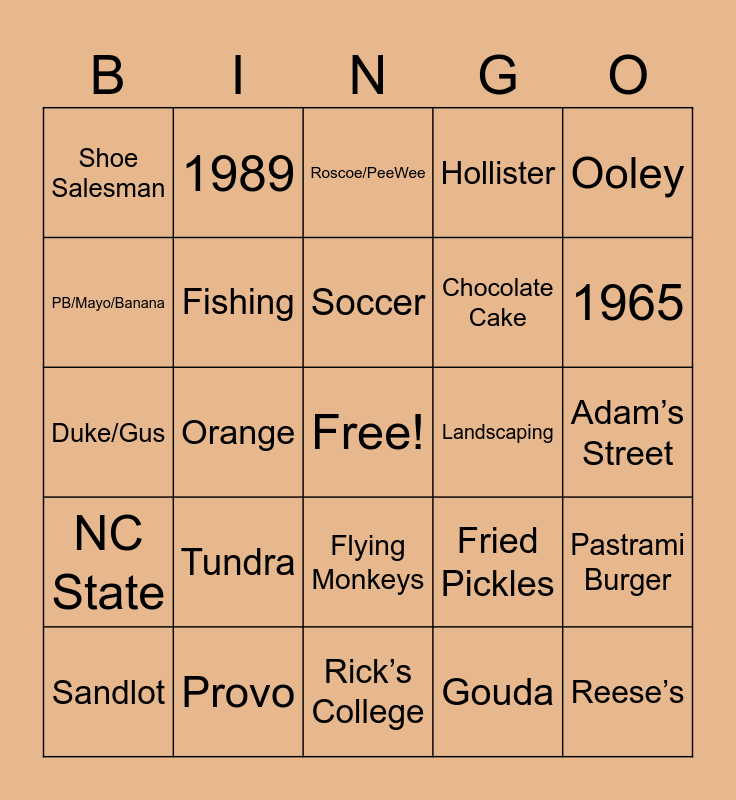 This bingo card has a free space and 29 words: Sandlot, Holland, Orange, Polly, Shoe Salesman, Roscoe/PeeWee, Fishing, Tundra, Landscaping, Provo, Adam’s Street, Reese’s, Rick’s College, Gouda, 1965, Speculous, Flying Monkeys, NC State, Ooley, Duke/Gus, Fried Pickles, Tulips, Chocolate Cake, PB/Mayo/Banana, Hollister, 1989, Pastrami Burger, Soccer and Uncle Doug.