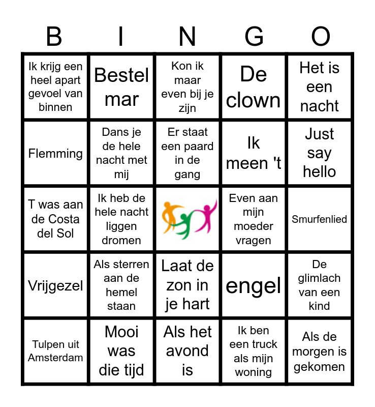 This bingo card has a free space and 50 words: Een eigen huis, Als de morgen is gekomen, Als de nacht verdwijnt, Als het avond is, Als sterren aan de hemel staan, Banger Hart, Bestel mar, Bossie Rode Rozen, Flemming, Dag Zuster Ursula, Dans je de hele nacht met mij, De clown, De glimlach van een kind, engel, Dromen zijn bedrog, Een beetje verliefd, Er staat een paard in de gang, Even aan mijn moeder vragen, Heb je even voor mij, Het is een nacht, Ik heb de hele nacht liggen dromen, Ik ben een truck als mijn woning, Ik krijg een heel apart gevoel van binnen, Ik meen 't, Ik verscheurde je foto, Jan Klaassen de trompetter, Just say hello, Kom van dat dak af, Kon ik maar even bij je zijn, Laat de zon in je hart, Leef, Malle Babbe, Meisjes met rode haren, Mexico, Mooi was die tijd, Oerend Hart, Ome Jan, Per spoor (Kedeng kedeng), Smoorverliefd, Smurfenlied, Stiekum gedanst, Stil in mij, T is weer voorbij die mooie zomer, T kleine cafe aan de haven, Tulpen uit Amsterdam, T was aan de Costa del Sol, Una Paloma Blanca, Vlieg met me mee, Vrijgezel and Zijn het je ogen.