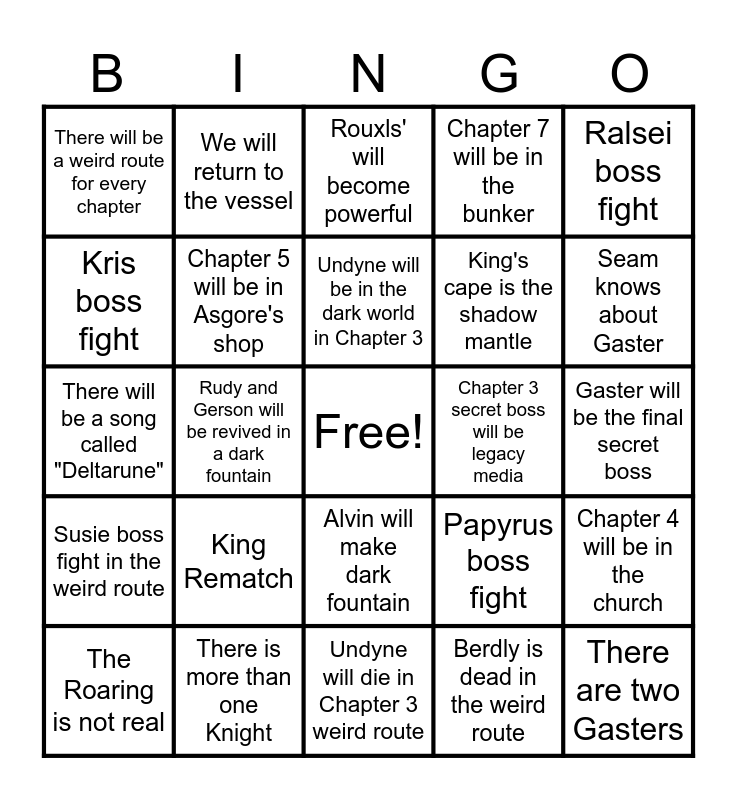 This bingo card has a free space and 24 words: King Rematch, There is more than one Knight, Undyne will be in the dark world in Chapter 3, The Roaring is not real, Ralsei boss fight, There will be a weird route for every chapter, Kris boss fight, We will return to the vessel, Chapter 3 secret boss will be legacy media, Alvin will make dark fountain, King's cape is the shadow mantle, There will be a song called "Deltarune", Papyrus boss fight, Chapter 4 will be in the church, Chapter 5 will be in Asgore's shop, Berdly is dead in the weird route, Gaster will be the final secret boss, Rouxls' will become powerful, Seam knows about Gaster, Rudy and Gerson will be revived in a dark fountain, There are two Gasters, Susie boss fight in the weird route, Chapter 7 will be in the bunker and Undyne will die in Chapter 3 weird route.