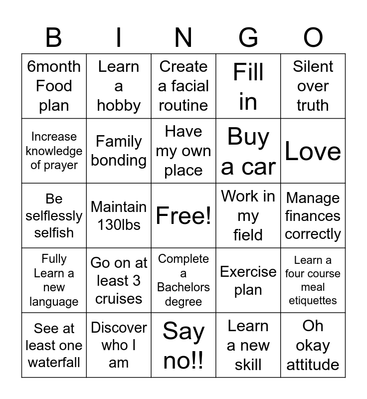 This bingo card has a free space and 24 words: Go on at least 3 cruises, Discover who I am, Have my own place, See at least one waterfall, Silent over truth, 6month Food plan, Increase knowledge of prayer, Learn a hobby, Work in my field, Complete a Bachelors degree, Buy a car, Be selflessly selfish, Exercise plan, Learn a four course meal etiquettes, Family bonding, Learn a new skill, Manage finances correctly, Create a facial routine, Love, Maintain 130lbs, Oh okay attitude, Fully Learn a new language, Fill in and Say no!!.