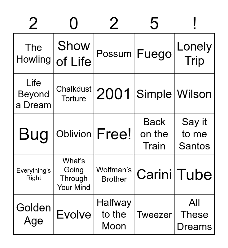 This bingo card has a free space and 24 words: What’s Going Through Your Mind, Evolve, 2001, Golden Age, Lonely Trip, The Howling, Life Beyond a Dream, Show of Life, Back on the Train, Wolfman’s Brother, Simple, Bug, Carini, Tube, Chalkdust Torture, Tweezer, Say it to me Santos, Possum, Wilson, Oblivion, All These Dreams, Everything’s Right, Fuego and Halfway to the Moon.