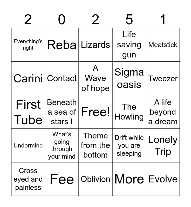 This bingo card has a free space and 24 words: What’s going through your mind, Fee, A Wave of hope, Cross eyed and painless, Meatstick, Everything’s right, Carini, Reba, The Howling, Theme from the bottom, Sigma oasis, First Tube, Drift while you are sleeping, Lonely Trip, Contact, More, A life beyond a dream, Lizards, Tweezer, Beneath a sea of stars I, Evolve, Undermind, Life saving gun and Oblivion.