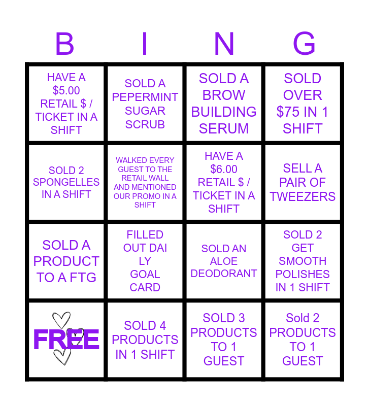 This bingo card has 1 images and 16 words: SOLD 4 PRODUCTS IN 1 SHIFT, SOLD 2 GET SMOOTH POLISHES IN 1 SHIFT, SOLD A BROW BUILDING SERUM, HAVE A $5.00 RETAIL $ / TICKET IN A SHIFT, SOLD A PRODUCT TO A FTG, SOLD A PEPERMINT SUGAR SCRUB, SOLD AN ALOE DEODORANT, SOLD 3 PRODUCTS TO 1 GUEST, SOLD 2 SPONGELLES IN A SHIFT, WALKED EVERY GUEST TO THE RETAIL WALL AND MENTIONED OUR PROMO IN A SHIFT, FREE, SOLD OVER $75 IN 1 SHIFT, FILLED OUT DAILY GOAL CARD, SELL A PAIR OF TWEEZERS, HAVE A $6.00 RETAIL $ / TICKET IN A SHIFT and Sold 2 PRODUCTS TO 1 GUEST.