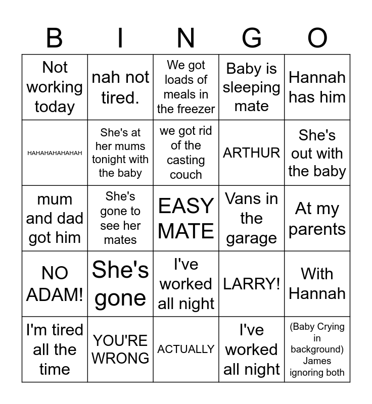 This bingo card has a free space and 25 words: She's gone, ACTUALLY, we got rid of the casting couch, I'm tired all the time, Hannah has him, Not working today, HAHAHAHAHAHAH, nah not tired., Vans in the garage, I've worked all night, ARTHUR, mum and dad got him, LARRY!, With Hannah, She's at her mums tonight with the baby, NO NATHAN, At my parents, We got loads of meals in the freezer, She's out with the baby, She's gone to see her mates, (Baby Crying in background) James ignoring both, YOU'RE WRONG, NO ADAM!, Baby is sleeping mate and I've worked all night.