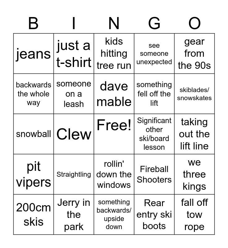 This bingo card has a free space and 29 words: 200cm skis, Carhartt bibs, Clew, yardsale, jeans, kids hitting tree run, someone on a leash, Straightling, Significant other ski/board lesson, Jerry in the park, taking out the lift line, fall off tow rope, something backwards/ upside down, Rear entry ski boots, skiblades/ snowskates, Texas length skis, rollin' down the windows, pit vipers, gear from the 90s, snowball, Fireball Shooters, fat nic clouds, something fell off the lift, backwards the whole way, see someone unexpected, just a t-shirt, we three kings, dave mable and raccoon.