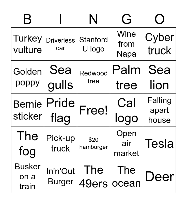 This bingo card has a free space and 60 words: BART train, In'n'Out Burger, A guy in a puffer vest, The fog, The ocean, Cable car, Sea gulls, Surf board, Palm tree, Oak tree, Wine from Napa, Quail, Golden poppy, Bear, Turkey, Turkey vulture, Deer, Cyber truck, Eucalyptus tree, Redwood tree, Cal logo, Stanford U logo, Busker on a train, Tesla, Mail box, Yellow school bus, Niche technology billboard, Broken car, Sea lion, Victorian house, See whiskey in restaurant, Add for weed dispensary, A weed dispensary, Christmas tree, Driverless car, Man bun (not Sam), Trump flag, Pride flag, Harris flag, Bernie sticker, Tiki drink, Pick-up truck, Falling apart house, Boat, Open air market, Hummingbird, Pelican, Art deco building, Street art, $20 hamburger, The 49ers, The A's, The Giants, E-bike, MLK-named something, Stars and stripes, California flag, Jeep, Banana slug and Free coffee refills.