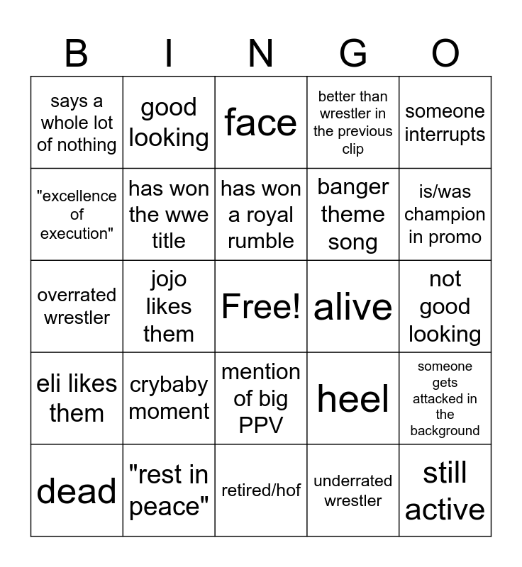 This bingo card has a free space and 24 words: crybaby moment, "rest in peace", has won a royal rumble, dead, someone interrupts, says a whole lot of nothing, "excellence of execution", good looking, alive, mention of big PPV, banger theme song, overrated wrestler, heel, someone gets attacked in the background, has won the wwe title, underrated wrestler, not good looking, face, is/was champion in promo, jojo likes them, still active, eli likes them, better than wrestler in the previous clip and retired/hof.
