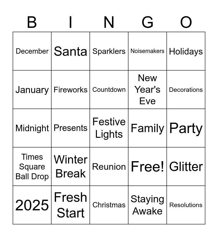 This bingo card has 25 words: Winter Break, Christmas, Countdown, 2025, Holidays, December, January, Santa, Family, Reunion, New Year's Eve, Midnight, Free!, Glitter, Fireworks, Resolutions, Party, Sparklers, Decorations, Presents, Festive Lights, Fresh Start, Times Square Ball Drop, Noisemakers and Staying Awake.