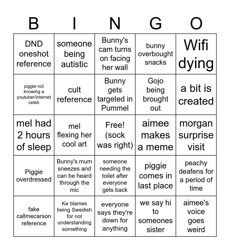 This bingo card has a free space and 24 words: Bunny's mum sneezes and can be heard through the mic, Ke blames being Swedish for not understanding something, Bunny gets targeted in Pummel, fake callmecarson reference, Wifi dying, DND oneshot reference, piggie not knowing a youtuber/internet celeb, someone being autistic, aimee makes a meme, someone needing the toilet after everyone gets back, Gojo being brought out, mel had 2 hours of sleep, piggie comes in last place, peachy deafens for a period of time, cult reference, we say hi to someones sister, morgan surprise visit, Bunny's cam turns on facing her wall, a bit is created, mel flexing her cool art, aimee's voice goes weird, Piggie overdressed, bunny overbought snacks and everyone says they're down for anything.