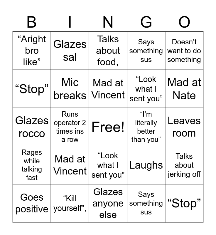 This bingo card has a free space and 77 words: “Aright bro like”, “Kill yourself”,, Talks about food,, “It’s not funny”,, “You’re so annoying”, Glazes rocco, Glazes sal, Glazes Anthony, Glazes anyone else, Talks about jerking off, Goes positive, Goes negative, “I’m literally better than you”, Mad at Nate, Leaves room, Mic breaks, Runs operator 2 times ins a row, Laughs, Says something sus, “Stop”, Rages while talking fast, Mad at Vincent, “Look what I sent you”, Doesn’t want to do something, “Aright bro like”, “Aright bro like”, “Aright bro like”, “Aright bro like”, “Aright bro like”, “Aright bro like”, “Kill yourself”,, Talks about food,, “It’s not funny”,, “You’re so annoying”, Glazes rocco, Glazes sal, Glazes Anthony, Glazes anyone else, Talks about jerking off, Goes positive, Goes negative, “I’m literally better than you”, Mad at Nate, Leaves room, Mic breaks, Runs operator 2 times ins a row, Laughs, Says something sus, “Stop”, Rages while talking fast, Mad at Vincent, “Look what I sent you”, Doesn’t want to do something, “Aright bro like”, “Kill yourself”,, Talks about food,, “It’s not funny”,, “You’re so annoying”, Glazes rocco, Glazes sal, Glazes anyone else, Glazes Anthony, Talks about jerking off, Goes positive, Goes negative, “I’m literally better than you”, Mad at Nate, Leaves room, Mic breaks, Runs operator 2 times ins a row, Laughs, Says something sus, “Stop”, Rages while talking fast, Mad at Vincent, “Look what I sent you” and Doesn’t want to do something.