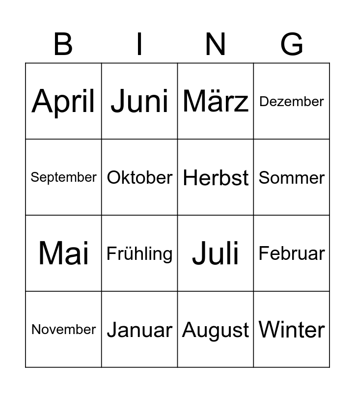 This bingo card has 16 words: Januar, Februar, März, April, Mai, Juni, Juli, August, September, Oktober, November, Dezember, Frühling, Sommer, Herbst and Winter.