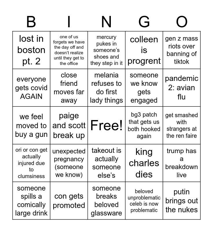 This bingo card has a free space and 24 words: someone spills a comically large drink, unexpected pregnancy (someone we know), melania refuses to do first lady things, beloved unproblematic celeb is now problematic, gen z mass riots over banning of tiktok, lost in boston pt. 2, one of us forgets we have the day off and doesn’t realize until they get to the office, mercury pukes in someone’s shoes and they step in it, bg3 patch that gets us both hooked again, get smashed with strangers at the ren faire, we feel moved to buy a gun, close friend moves far away, king charles dies, trump has a breakdown live, everyone gets covid AGAIN, con gets promoted, someone breaks beloved glassware, colleen is progrent, pandemic 2: avian flu, ori or con get actually injured due to clumsiness, paige and scott break up, takeout is actually someone else’s, someone we know gets engaged and putin brings out the nukes.