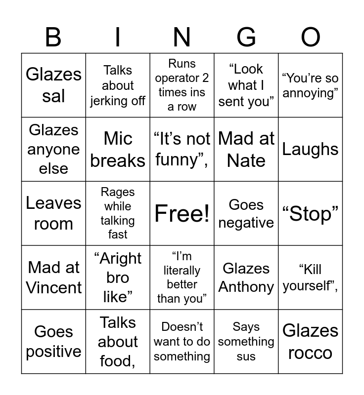 This bingo card has a free space and 24 words: “Aright bro like”, Talks about food,, “It’s not funny”,, Goes positive, “You’re so annoying”, Glazes sal, Glazes anyone else, Talks about jerking off, Goes negative, “I’m literally better than you”, Mad at Nate, Leaves room, Glazes Anthony, “Kill yourself”,, Mic breaks, Says something sus, “Stop”, Runs operator 2 times ins a row, Laughs, Rages while talking fast, Glazes rocco, Mad at Vincent, “Look what I sent you” and Doesn’t want to do something.