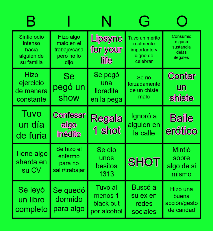 This bingo card has 25 words: Se hizo el enfermo para no salir/trabajar, Tuvo al menos 1 black out por alcohol, Se pegó una lloradita en la pega, Se leyó un libro completo, Consumió alguna sustancia delas ilegales, Sintió odio intenso hacia alguien de su familia, Hizo ejercicio de manera constante, Hizo algo malo en el trabajo/casa pero no lo dijo, Ignoró a alguien en la calle, Se dio unos besitos 1313, Se rió forzadamente de un chiste malo, Tuvo un día de furia, SHOT, Mintió sobre algo de si mismo, Se pegó un show, Hizo una buena acción/gesto de caridad, Baile erótico, Lipsync for your life, Contar un shiste, Confesar algo inédito, Regala 1 shot, Se quedó dormido para algo, Tiene algo shanta en su CV, Tuvo un mérito realmente importante y digno de celebrar and Buscó a su ex en redes sociales.