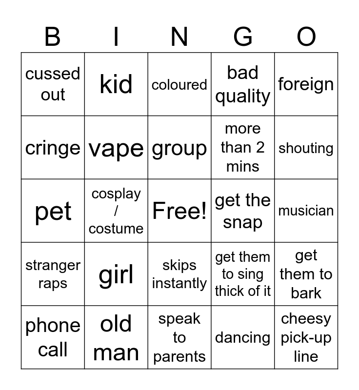 This bingo card has a free space and 24 words: girl, old man, group, phone call, foreign, cussed out, cringe, kid, get the snap, skips instantly, more than 2 mins, pet, get them to sing thick of it, get them to bark, vape, dancing, musician, coloured, shouting, cosplay / costume, cheesy pick-up line, stranger raps, bad quality and speak to parents.