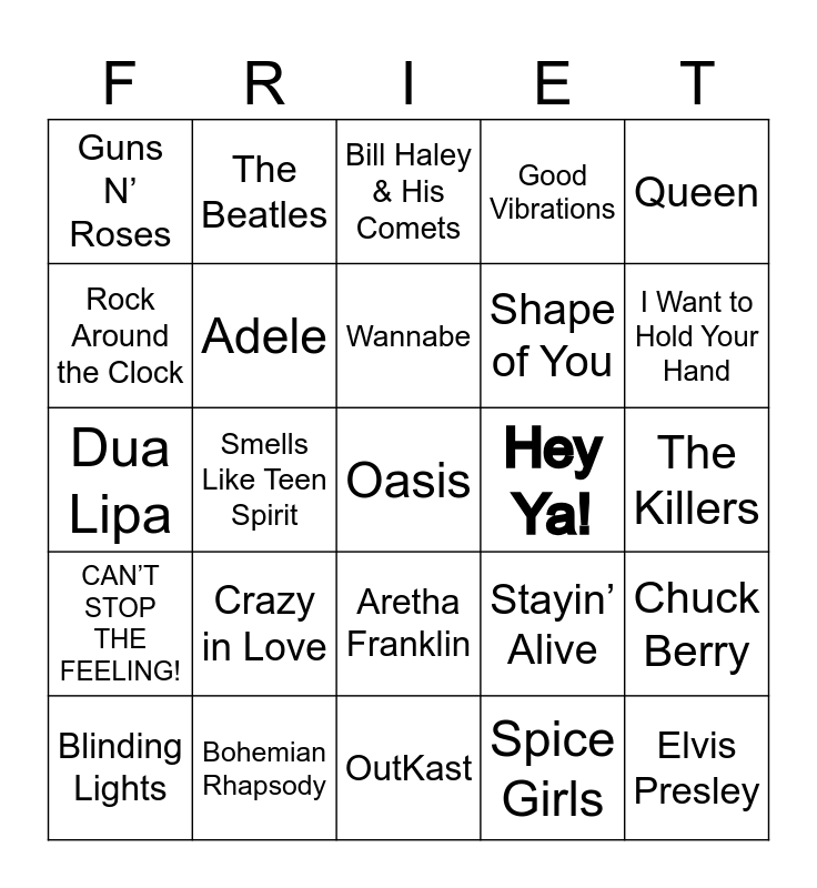 This bingo card has 50 words: Jailhouse Rock, Oasis, Uptown Funk, OutKast, Crazy in Love, Rolling in the Deep, The Beatles, Billie Jean, Rock Around the Clock, Beyoncé feat. Jay-Z, Adele, Good Vibrations, Chuck Berry, Stayin’ Alive, Respect, Superstition, Wannabe, Hey Ya!, Like a Prayer, Queen, Smells Like Teen Spirit, Spice Girls, Guns N’ Roses, Shape of You, Mr. Brightside, Elvis Presley, I Want to Hold Your Hand, Johnny B. Goode, Bill Haley & His Comets, Aretha Franklin, Stevie Wonder, The Beach Boys, Michael Jackson, Bee Gees, Bohemian Rhapsody, Nirvana, Wonderwall, Sweet Child O’ Mine, Madonna, The Killers, Levitating, The Weeknd, Mark Ronson feat. Bruno Mars, Ed Sheeran, Blinding Lights, Dua Lipa, Drivers License, Olivia Rodrigo, CAN’T STOP THE FEELING! and Justin Timberlake.