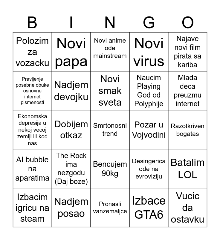 This bingo card has a free space and 24 words: The Rock ima nezgodu (Daj boze), Nadjem posao, Novi smak sveta, Izbacim igricu na steam, Najave novi film pirata sa kariba, Polozim za vozacku, Pravljenje posebne obuke osnovne internet pismenosti, Novi papa, Pozar u Vojvodini, Bencujem 90kg, Naucim Playing God od Polyphije, Ekonomska depresija u nekoj vecoj zemlji ili kod nas, Desingerica ode na evroviziju, Batalim LOL, Nadjem devojku, Izbace GTA6, Razotkriven bogatas, Novi anime ode mainstream, Mlada deca preuzmu internet, Dobijem otkaz, Vucic da ostavku, AI bubble na aparatima, Novi virus and Pronasli vanzemaljce.