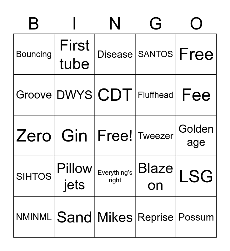 This bingo card has a free space and 24 words: Pillow jets, Sand, CDT, NMINML, Free, Bouncing, Groove, First tube, Tweezer, Everything’s right, Fluffhead, Zero, Blaze on, LSG, DWYS, Reprise, Golden age, Disease, Fee, Gin, Possum, SIHTOS, SANTOS and Mikes.