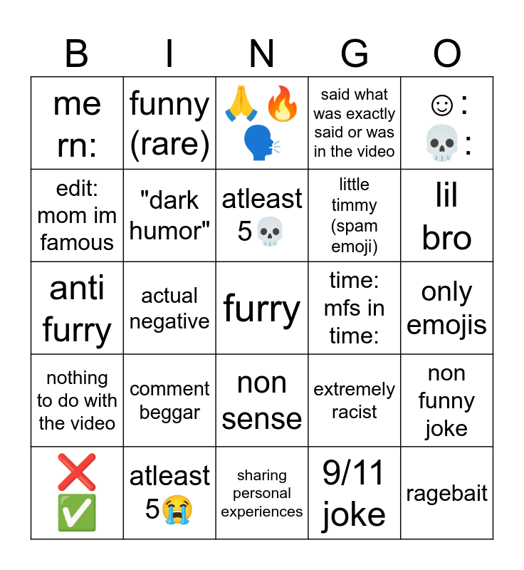 This bingo card has a free space and 24 words: comment beggar, atleast 5π, atleast 5π, β β , βΊοΈ: π:, me rn:, edit: mom im famous, funny (rare), time: mfs in time:, non sense, little timmy (spam emoji), anti furry, extremely racist, non funny joke, "dark humor", 9/11 joke, only emojis, ππ₯π£οΈ, lil bro, actual negative, ragebait, nothing to do with the video, said what was exactly said or was in the video and sharing personal experiences.