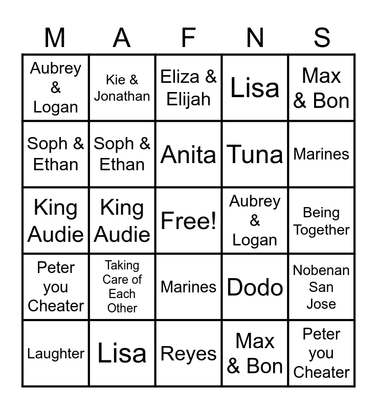 ⚠ This card has duplicate items: Mama's Cooking (2), Nonns (2), Erin (2), Nobenan San Jose (2), Family (2), Missing Bubba (2), Kie & Jonathan (2), Frank & Chilang (2), Anita (2), Rhea & Geck (2), Marines (2), Laughter (2), Being Together (2), Max & Bon (2), Soph & Ethan (2), King Audie (2), Aubrey & Logan (2), Love (2), Tuna (2), Taking Care of Each Other (2), Peter you Cheater (2), Lisa (2), 2025 (2)