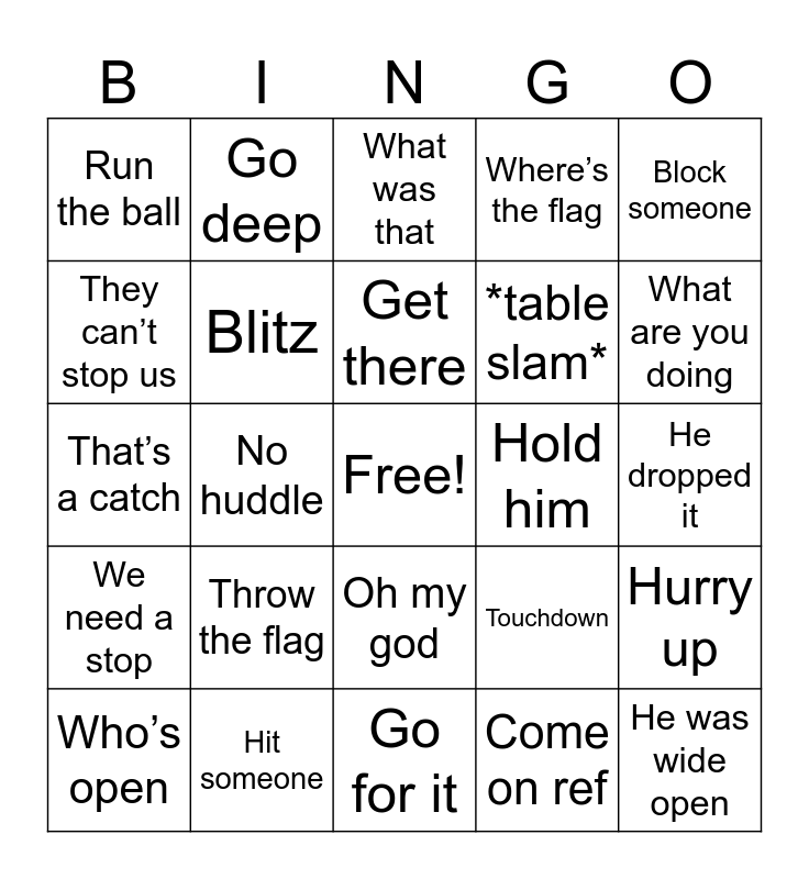 This bingo card has a free space and 24 words: Who’s open, Throw the flag, Get there, Come on ref, Block someone, Run the ball, Go deep, What was that, Hold him, He dropped it, That’s a catch, Blitz, Touchdown, Hurry up, They can’t stop us, Hit someone, Go for it, Where’s the flag, What are you doing, We need a stop, No huddle, Oh my god, *table slam* and He was wide open.