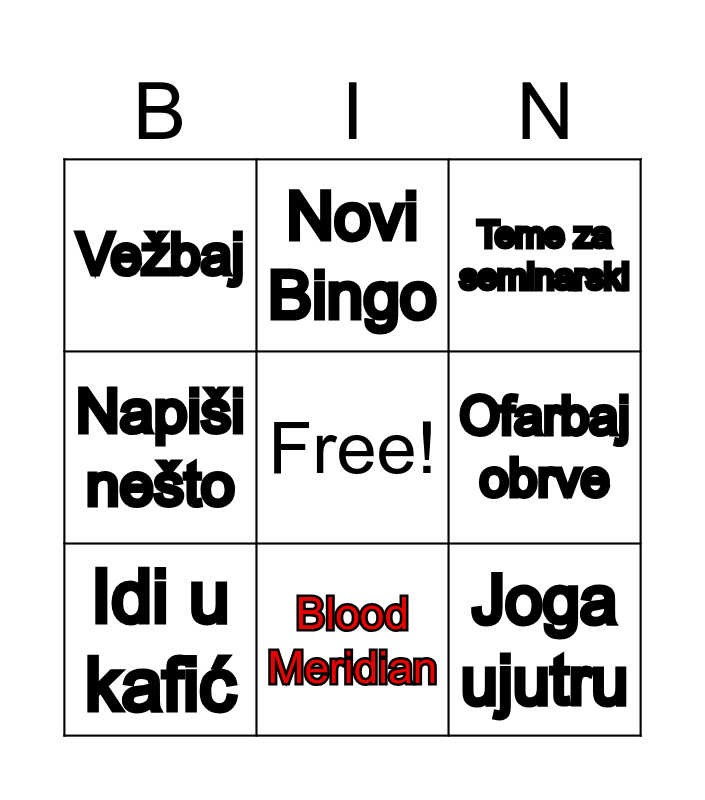 This bingo card has a free space and 8 words: Ofarbaj obrve, Teme za seminarski, Novi Bingo, Idi u kafić, Vežbaj, Joga ujutru, Napiši nešto and Blood Meridian.