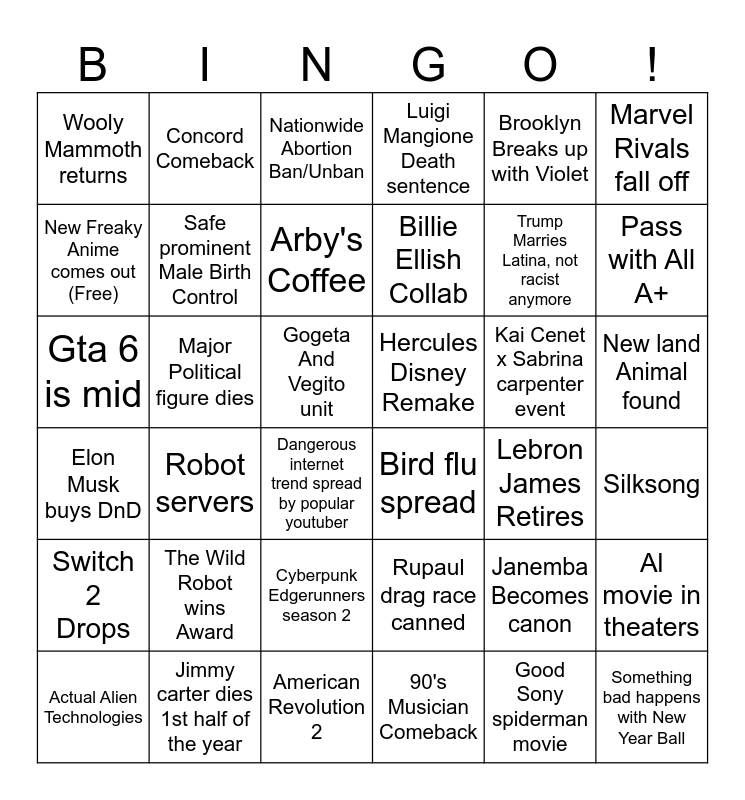 This bingo card has 36 words: Elon Musk buys DnD, Robot servers, American Revolution 2, Billie Ellish Collab, Kai Cenet x Sabrina carpenter event, New land Animal found, Wooly Mammoth returns, Jimmy carter dies 1st half of the year, Nationwide Abortion Ban/Unban, Rupaul drag race canned, Trump Marries Latina, not racist anymore, Marvel Rivals fall off, Switch 2 Drops, Major Political figure dies, Arby's Coffee, Luigi Mangione Death sentence, Janemba Becomes canon, Silksong, New Freaky Anime comes out (Free), Safe prominent Male Birth Control, Dangerous internet trend spread by popular youtuber, Bird flu spread, Lebron James Retires, Al movie in theaters, Gta 6 is mid, Concord Comeback, Gogeta And Vegito unit, 90's Musician Comeback, Brooklyn Breaks up with Violet, Pass with All A+, Actual Alien Technologies, The Wild Robot wins Award, Cyberpunk Edgerunners season 2, Hercules Disney Remake, Good Sony spiderman movie and Something bad happens with New Year Ball.