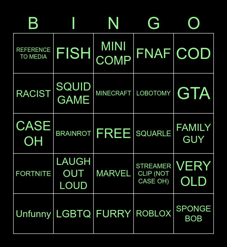 This bingo card has a free space and 24 words: Unfunny, LAUGH OUT LOUD, MINECRAFT, ROBLOX, COD, REFERENCE TO MEDIA, FISH, MINI COMP, SQUARLE, FAMILY GUY, CASE OH, SQUID GAME, STREAMER CLIP (NOT CASE OH), VERY OLD, RACIST, LGBTQ, FURRY, FNAF, GTA, FORTNITE, BRAINROT, MARVEL, LOBOTOMY and SPONGE BOB.