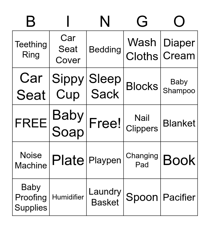 This bingo card has a free space and 42 words: Onesie, Sleep Sack, Bottle, Plate, Spoon, Book, Pacifier, Bottle Warmer, Bedding, Playpen, Blanket, Baby Shampoo, Baby Soap, Diaper Cream, Bath Toy, Changing Pad, Bottle Brush, FREE, Bottle Drying Rack, Car Seat Cover, Car Seat, Rattle, Teething Mit, Teething Ring, Bead Maze, Baby Toothbrush, Blocks, DUPLO, Sunscreen, Swing, Puzzle, Noise Machine, Sippy Cup, Laundry Basket, Little People, Baby Proofing Supplies, Humidifier, Nail Clippers, Thermometer, Bibs, Wash Cloths and Stuffed Animal.