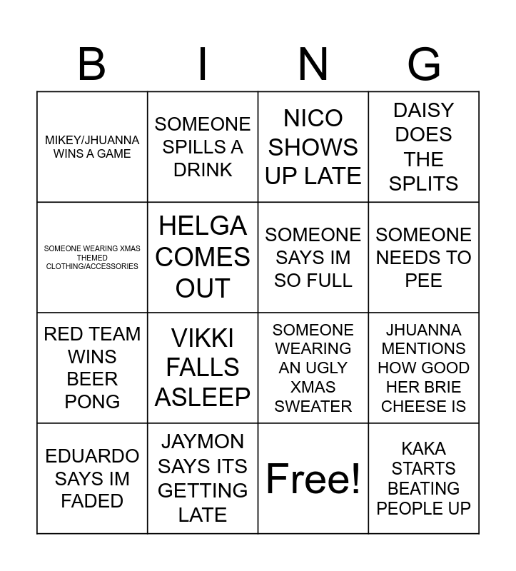 This bingo card has 17 words: Free!, EDUARDO SAYS IM FADED, NICO SHOWS UP LATE, MIKEY/JHUANNA WINS A GAME, VIKKI FALLS ASLEEP, DAISY DOES THE SPLITS, JHUANNA MENTIONS HOW GOOD HER BRIE CHEESE IS, SOMEONE SAYS IM SO FULL, SOMEONE NEEDS TO PEE, HELGA COMES OUT, JAYMON SAYS ITS GETTING LATE, SOMEONE WEARING AN UGLY XMAS SWEATER, SOMEONE WEARING XMAS THEMED CLOTHING/ACCESSORIES, SOMEONE SPILLS A DRINK, RED TEAM WINS BEER PONG, SOMEONE FORGETS TO TAKE THEIR SHOT and KAKA STARTS BEATING PEOPLE UP.