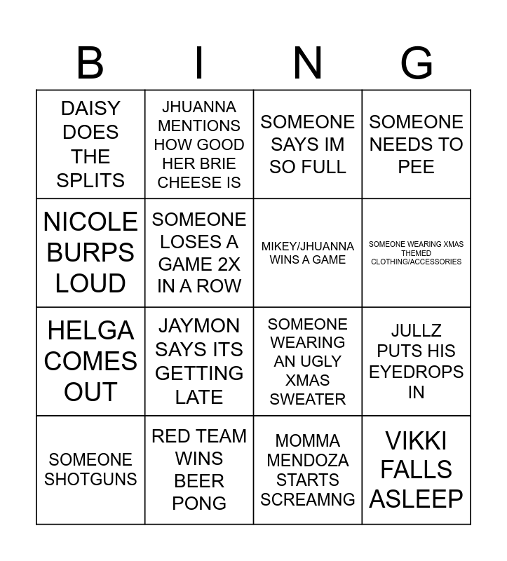 This bingo card has 22 words: EDUARDO SAYS IM FADED, NICO SHOWS UP LATE, MIKEY/JHUANNA WINS A GAME, VIKKI FALLS ASLEEP, DAISY DOES THE SPLITS, JHUANNA MENTIONS HOW GOOD HER BRIE CHEESE IS, SOMEONE SAYS IM SO FULL, SOMEONE NEEDS TO PEE, HELGA COMES OUT, JAYMON SAYS ITS GETTING LATE, SOMEONE WEARING AN UGLY XMAS SWEATER, SOMEONE WEARING XMAS THEMED CLOTHING/ACCESSORIES, SOMEONE SPILLS A DRINK, RED TEAM WINS BEER PONG, SOMEONE FORGETS TO TAKE THEIR SHOT, KAKA STARTS BEATING PEOPLE UP, SOMEONE SHOTGUNS, SOMEONE LOSES A GAME 2X IN A ROW, MOMMA MENDOZA STARTS SCREAMNG, JULLZ PUTS HIS EYEDROPS IN, NICOLE BURPS LOUD and DADA SAYS SHES COLD.
