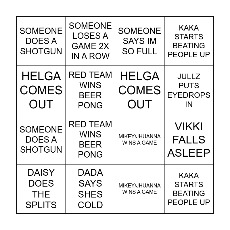 This bingo card has 66 words: EDUARDO SAYS IM FADED, NICO SHOWS UP LATE, MIKEY/JHUANNA WINS A GAME, VIKKI FALLS ASLEEP, DAISY DOES THE SPLITS, JHUANNA MENTIONS HOW GOOD HER BRIE CHEESE IS, SOMEONE SAYS IM SO FULL, SOMEONE NEEDS TO PEE, HELGA COMES OUT, JAYMON SAYS ITS GETTING LATE, SOMEONE WEARING AN UGLY XMAS SWEATER, SOMEONE WEARING XMAS THEMED CLOTHING/ACCESSORIES, SOMEONE SPILLS A DRINK, RED TEAM WINS BEER PONG, SOMEONE FORGETS TO TAKE THEIR SHOT, KAKA STARTS BEATING PEOPLE UP, SOMEONE DOES A SHOTGUN, SOMEONE LOSES A GAME 2X IN A ROW, MOMMA MENDOZA STARTS SCREAMING, JULLZ PUTS EYEDROPS IN, NICOLE BURPS LOUD, DADA SAYS SHES COLD, MIKEY/JHUANNA WINS A GAME, VIKKI FALLS ASLEEP, EDUARDO SAYS IM FADED, NICO SHOWS UP LATE, SOMEONE SAYS IM SO FULL, SOMEONE NEEDS TO PEE, DAISY DOES THE SPLITS, JHUANNA MENTIONS HOW GOOD HER BRIE CHEESE IS, SOMEONE WEARING AN UGLY XMAS SWEATER, SOMEONE WEARING XMAS THEMED CLOTHING/ACCESSORIES, HELGA COMES OUT, JAYMON SAYS ITS GETTING LATE, SOMEONE FORGETS TO TAKE THEIR SHOT, KAKA STARTS BEATING PEOPLE UP, SOMEONE SPILLS A DRINK, RED TEAM WINS BEER PONG, MOMMA MENDOZA STARTS SCREAMING, JULLZ PUTS EYEDROPS IN, SOMEONE DOES A SHOTGUN, SOMEONE LOSES A GAME 2X IN A ROW, NICOLE BURPS LOUD, DADA SAYS SHES COLD, EDUARDO SAYS IM FADED, NICO SHOWS UP LATE, MIKEY/JHUANNA WINS A GAME, VIKKI FALLS ASLEEP, SOMEONE DOES A SHOTGUN, SOMEONE LOSES A GAME 2X IN A ROW, MOMMA MENDOZA STARTS SCREAMING, JULLZ PUTS EYEDROPS IN, NICOLE BURPS LOUD, DADA SAYS SHES COLD, DAISY DOES THE SPLITS, JHUANNA MENTIONS HOW GOOD HER BRIE CHEESE IS, SOMEONE SAYS IM SO FULL, SOMEONE NEEDS TO PEE, HELGA COMES OUT, JAYMON SAYS ITS GETTING LATE, SOMEONE WEARING AN UGLY XMAS SWEATER, SOMEONE WEARING XMAS THEMED CLOTHING/ACCESSORIES, SOMEONE SPILLS A DRINK, RED TEAM WINS BEER PONG, SOMEONE FORGETS TO TAKE THEIR SHOT and KAKA STARTS BEATING PEOPLE UP.