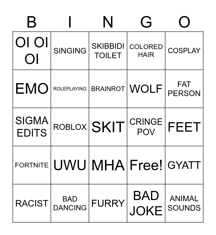 This bingo card has 25 words: UWU, FURRY, BRAINROT, RACIST, COSPLAY, OI OI OI, EMO, SINGING, CRINGE POV, MHA, WOLF, SIGMA EDITS, Free!, GYATT, ROLEPLAYING, ANIMAL SOUNDS, FEET, SKIBBIDI TOILET, FAT PERSON, ROBLOX, SKIT, BAD DANCING, FORTNITE, COLORED HAIR and BAD JOKE.