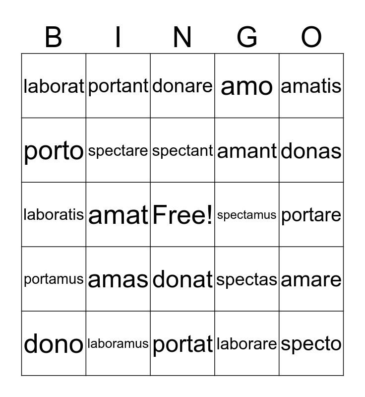 This bingo card has a free space and 24 words: amas, laboramus, spectant, dono, amatis, laborat, porto, portant, spectamus, donat, amant, laboratis, spectas, amare, spectare, laborare, portare, donare, donas, amat, specto, portamus, amo and portat.