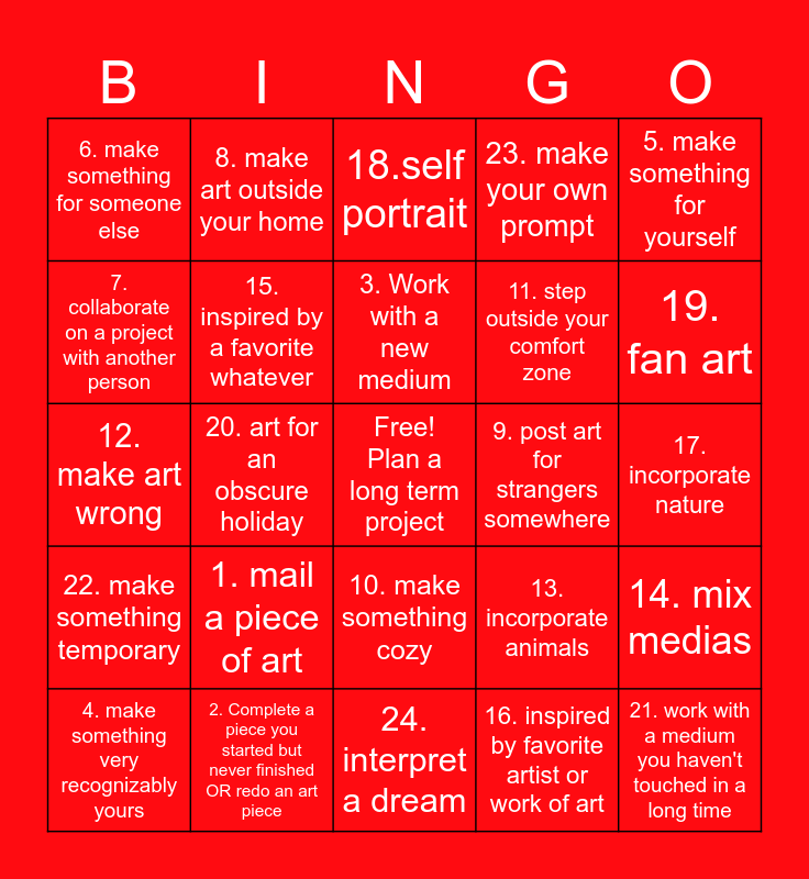 This bingo card has a free space and 24 words: 1. mail a piece of art, 2. Complete a piece you started but never finished OR redo an art piece, 3. Work with a new medium, 4. make something very recognizably yours, 5. make something for yourself, 6. make something for someone else, 7. collaborate on a project with another person, 8. make art outside your home, 9. post art for strangers somewhere, 10. make something cozy, 11. step outside your comfort zone, 12. make art wrong, 13. incorporate animals, 14. mix medias, 15. inspired by a favorite whatever, 16. inspired by favorite artist or work of art, 17. incorporate nature, 18.self portrait, 19. fan art, 20. art for an obscure holiday, 21. work with a medium you haven't touched in a long time, 22. make something temporary, 23. make your own prompt and 24. interpret a dream.