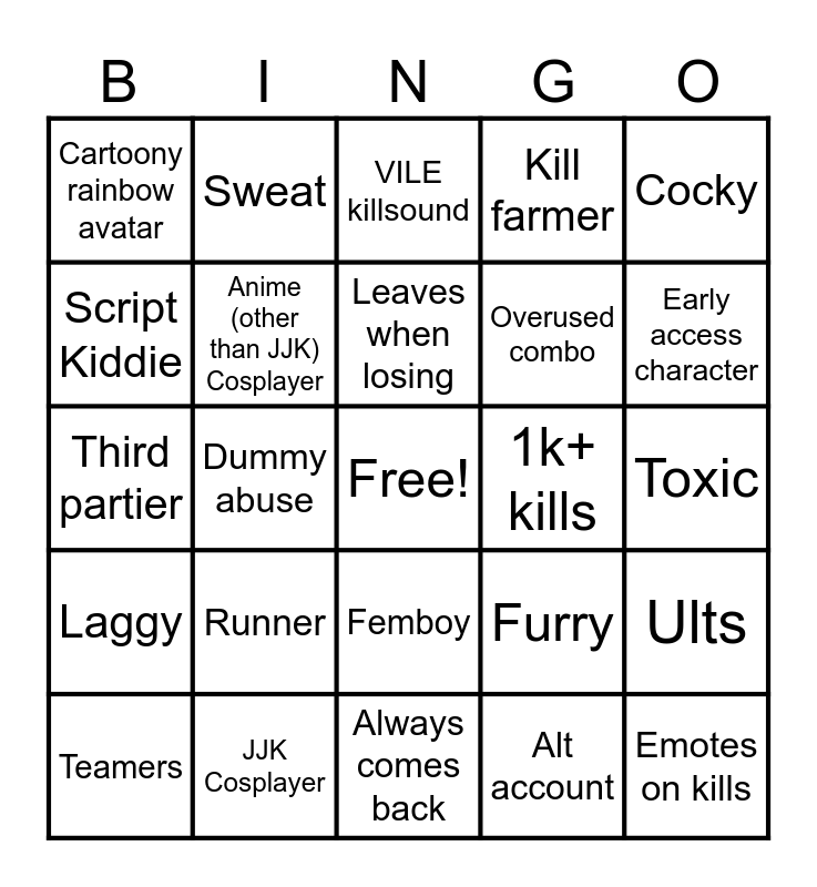 This bingo card has a free space and 24 words: Runner, JJK Cosplayer, Leaves when losing, Teamers, Cocky, Cartoony rainbow avatar, Script Kiddie, Sweat, 1k+ kills, Femboy, Overused combo, Third partier, Furry, Ults, Anime (other than JJK) Cosplayer, Alt account, Toxic, VILE killsound, Early access character, Dummy abuse, Emotes on kills, Laggy, Kill farmer and Always comes back.