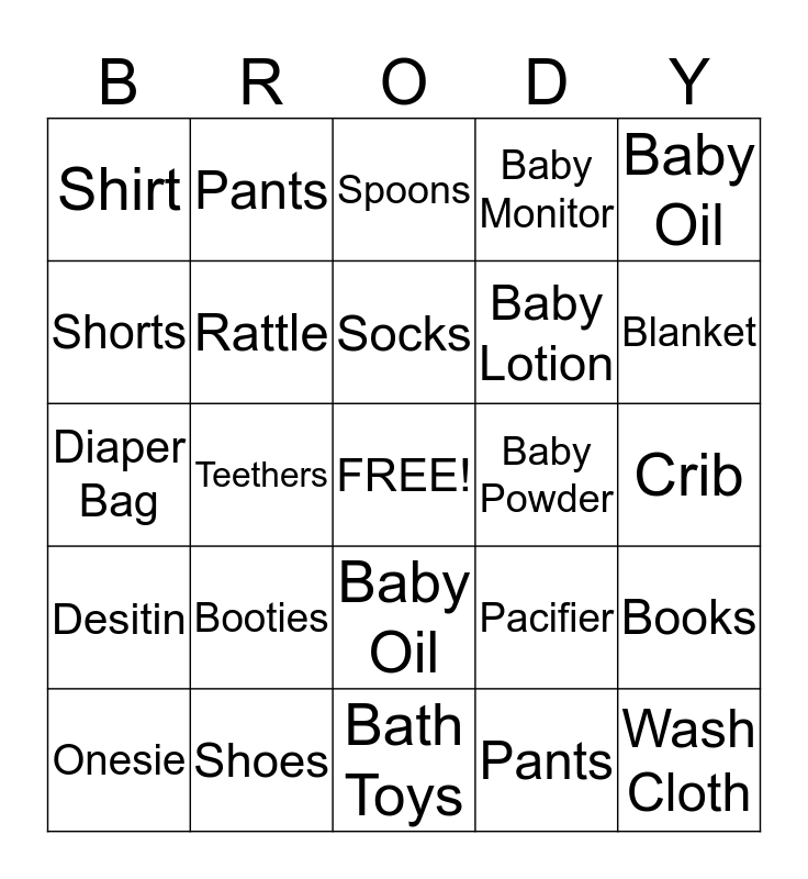This bingo card has a free space and 24 words: Booties, Shoes, Socks, Onesie, Baby Oil, Shirt, Shorts, Pants, Baby Powder, Baby Oil, Baby Lotion, Diaper Bag, Pacifier, Books, Rattle, Pants, Crib, Spoons, Blanket, Teethers, Wash Cloth, Desitin, Baby Monitor and Bath Toys.