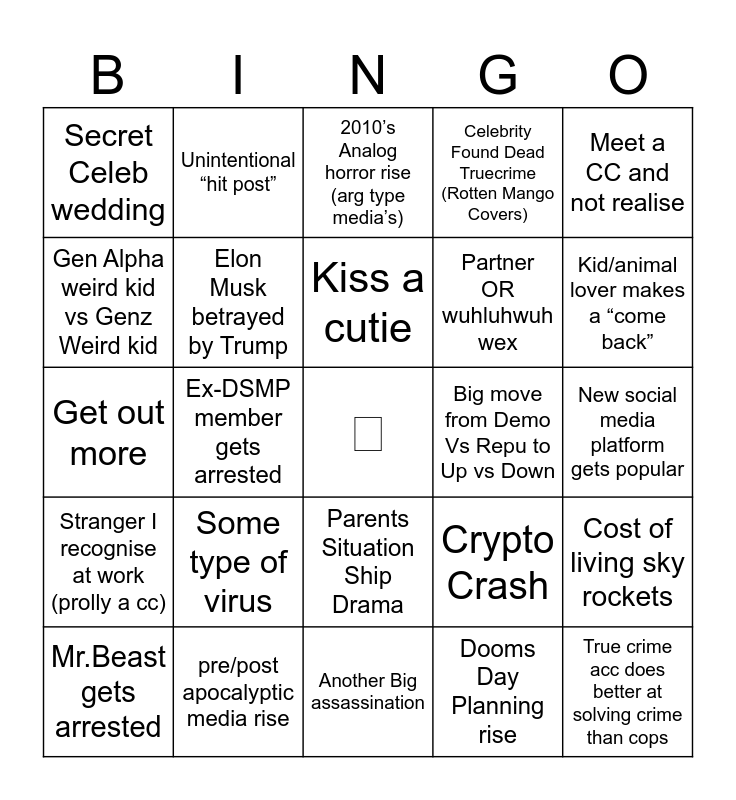 This bingo card has a free space and 39 words: Fan Fav Is A Pedo, Trump has 2+ assassination attempts, I get cancelled, Elon Musk betrayed by Trump, Mr.Beast gets arrested, Parents Situation Ship Drama, Kiss a cutie, Joke post gets noticed by a CC, Meet a CC and not realise, Stranger I recognise at work (prolly a cc), Ex-DSMP member gets arrested, Celebrity Found Dead Truecrime (Rotten Mango Covers), True crime acc does better at solving crime than cops, New social media platform gets popular, Big move from Demo Vs Repu to Up vs Down, Some type of virus, Birth rate drop, Secret Celeb wedding, Fandom culture shift, Crypto Crash, Gen Alpha weird kid vs Genz Weird kid, Another Big assassination, Partner OR wuhluhwuh wex, Kid/animal lover makes a “come back”, Fnaf 2 Movie, EXTREMELY popular murder/serial killer copycat, Huge KPop scandal that listeners n non listener are shocked, Rise in nzi/supremacism/ Nationalism, Family member comes out, Unintentional “hit post”, Rise in “ nostalgia media”, I yap at creepypastas at least once a month, 2010’s Analog horror rise (arg type media’s), pre/post apocalyptic media rise, Dooms Day Planning rise, American town gets wiped flat, Cost of living sky rockets, Get out more and Roblox drama/ Rise????.