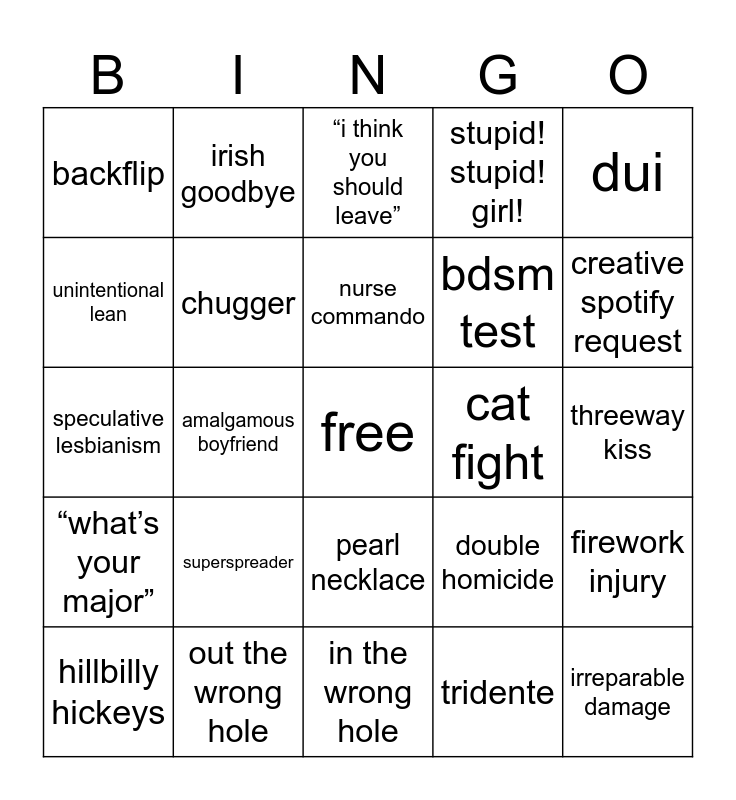 This bingo card has a free space and 24 words: hillbilly hickeys, superspreader, nurse commando, tridente, dui, backflip, irish goodbye, “i think you should leave”, cat fight, threeway kiss, speculative lesbianism, chugger, double homicide, firework injury, unintentional lean, out the wrong hole, in the wrong hole, stupid! stupid! girl!, creative spotify request, “what’s your major”, amalgamous boyfriend, pearl necklace, bdsm test and irreparable damage.