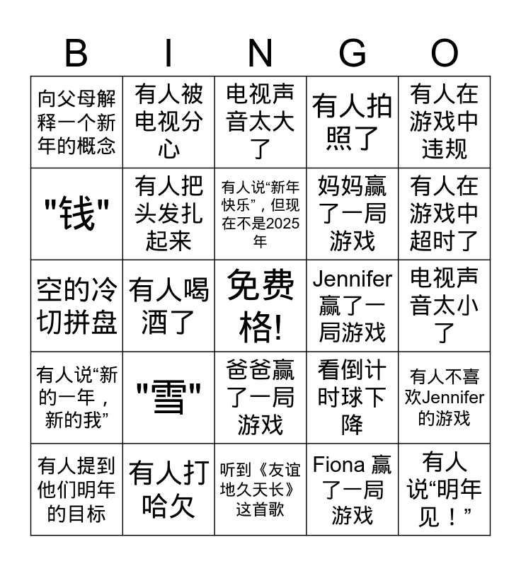 This bingo card has a free space and 24 words: "雪", 有人打哈欠, 有人说“新年快乐”,但现在不是2025年, 有人提到他们明年的目标, 有人在游戏中违规, 向父母解释一个新年的概念, "钱", 有人被电视分心, Jennifer 赢了一局游戏, 爸爸赢了一局游戏, 妈妈赢了一局游戏, 空的冷切拼盘, 看倒计时球下降, 有人不喜欢Jennifer的游戏, 有人把头发扎起来, Fiona 赢了一局游戏, 电视声音太小了, 电视声音太大了, 有人在游戏中超时了, 有人喝酒了, 有人说“明年见!”, 有人说“新的一年,新的我”, 有人拍照了 and 听到《友谊地久天长》这首歌.