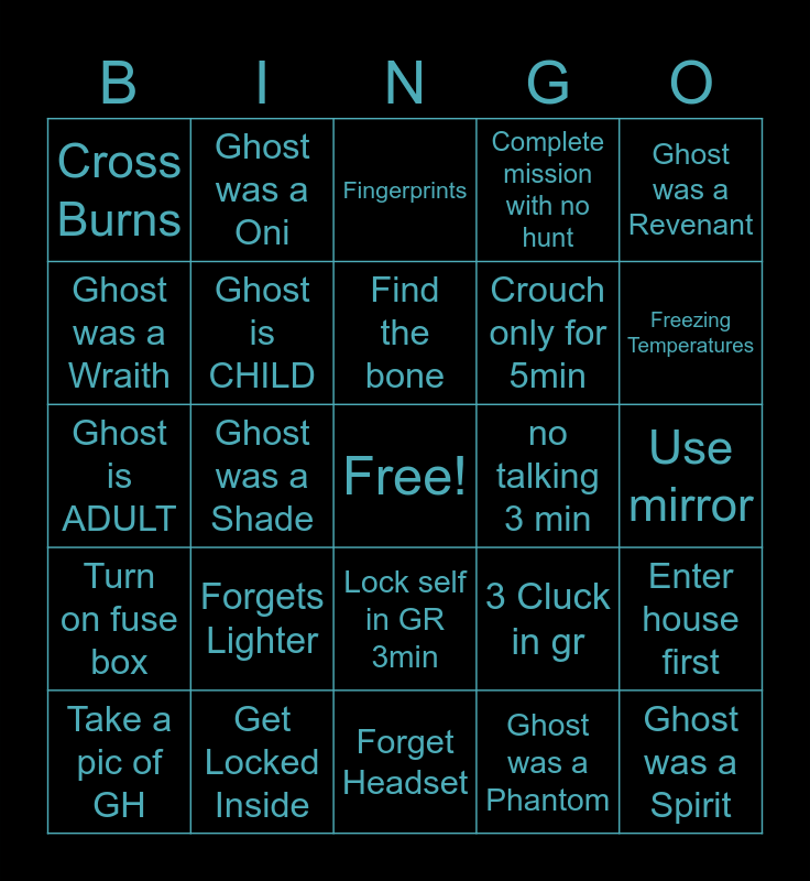 This bingo card has a free space and 74 words: Twizted Dies, Ghost was The Mimic, Fingerprints, Ghost whispers, Ghost was a Yokai, Spirit Box, Footprints, EMF, Take a pic of GH, Ghost was a Mare, Ghost was a Demon, D.O.T.S, Find the bone, Ghost was a Wraith, Ghost Orbs, Ghost was a Shade, Ghost Writing, Freezing Temperatures, Ghost knocked something around, Ghost is ADULT, Ghost is CHILD, Ghost was a Oni, Complete mission with no hunt, Kai Dies, Ghost was a Spirit, Ghost was a Poltergeist, Find a dog pic, Ghost was a Raiju, Ghost was a Moroi, GH yells, Ghost was a Revenant, Ghost was a Yurei, Find a cat pic, Sanity at 25%, Ghost was a Obake, Ghost was a Phantom, Scare other GH, Ghost was a Goryo, Ghost was The Twins, Ghost Photo, Forget Headset, Get Locked Inside, Get T-Bagged, Your Map Chosen, Drops Item Not Set, Cross Burns, Salty Toes, Forgets Lighter, Sanity at 60%, Map is daytime, Map is snowing, Map is raining, Use mirror, Use monkey paw, Blow out candle, Use incense on ghost, Lock self in GR 3min, Lock self in GR 5min, Lock self in GR 1min, Enter house first, Crouch only for 5min, Stay in van 1RD, Turn on fuse box, whisper only 3 min, no talking 3 min, 3 Bark in gr, 3 Meow in gr, 3 MOO in gr, 3 Cluck in gr, Kai Sip, Twizted Sip, Sip with pinky up, ASMR and 1 push up.
