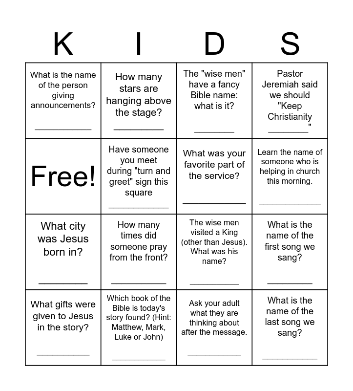This bingo card has 16 words: Which book of the Bible is today's story found? (Hint: Matthew, Mark, Luke or John) ____________, What is the name of the first song we sang? _________, The "wise men" have a fancy Bible name: what is it? ________, What is the name of the person giving announcements? ____________, What city was Jesus born in? ________, How many stars are hanging above the stage? _________, The wise men visited a King (other than Jesus). What was his name? ___________, Ask your adult what they are thinking about after the message. ____________, Free!, Have someone you meet during "turn and greet" sign this square ____________, What gifts were given to Jesus in the story? __________, Pastor Jeremiah said we should "Keep Christianity ________", How many times did someone pray from the front? ___________, Learn the name of someone who is helping in church this morning. ______________, What was your favorite part of the service? ____________ and What is the name of the last song we sang? ___________.