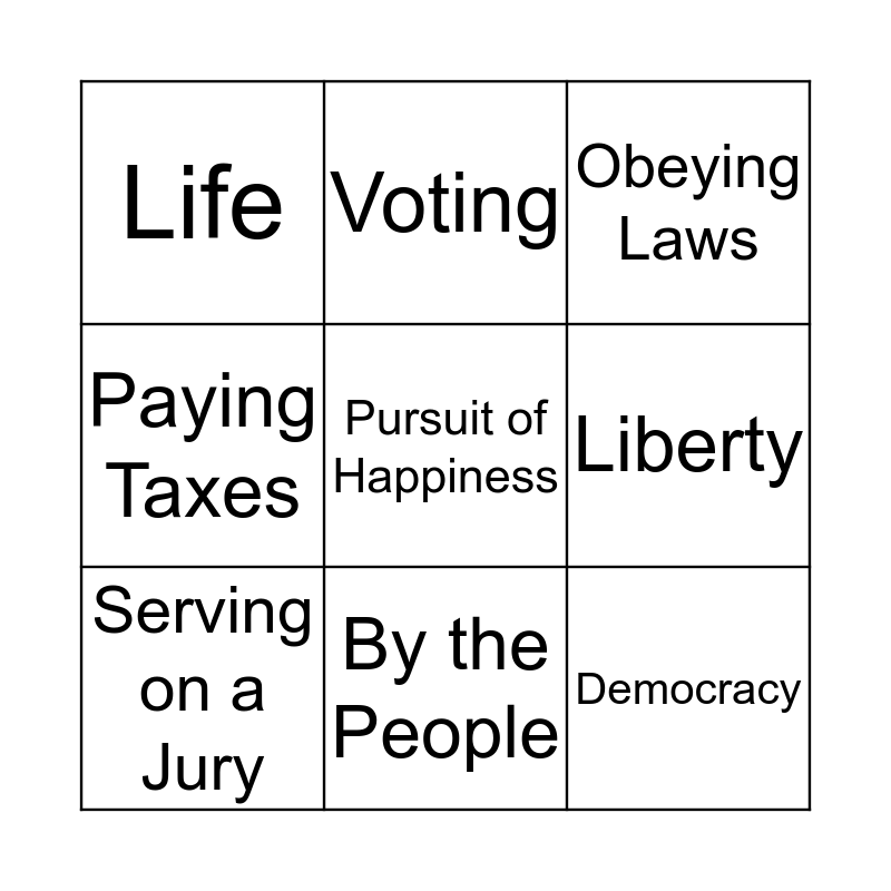 This bingo card has 9 words: Serving on a Jury, Obeying Laws, Voting, Paying Taxes, Life, Liberty, Pursuit of Happiness, Democracy and By the People.