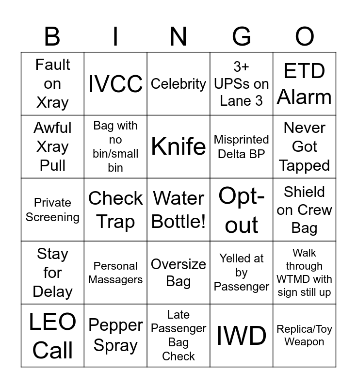 This bingo card has a free space and 24 words: Personal Massagers, Pepper Spray, Knife, LEO Call, ETD Alarm, Fault on Xray, Awful Xray Pull, IVCC, Opt-out, Oversize Bag, Misprinted Delta BP, Private Screening, Yelled at by Passenger, Walk through WTMD with sign still up, Bag with no bin/small bin, IWD, Shield on Crew Bag, Celebrity, Never Got Tapped, Check Trap, Replica/Toy Weapon, Stay for Delay, 3+ UPSs on Lane 3 and Late Passenger Bag Check.